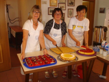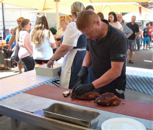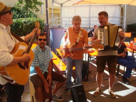Mit dem Frühschoppen wurde der Sonntag eröffnet. Hier spielten zur Unterhaltung „Die Scheinheiligen“. Eine bekannte und beliebte Truppe, die ihre gute Laune von Tisch zu Tisch verbreitete. Damit man sicher auch den bekannt guten Schweinebraten mit Spotz`n bekommt, stellten sich die Hungrigen schon eine dreiviertel Stunde vor der Essensausgabe an. Es gab aber für jeden etwas, denn der Verein hatte mit 400 Portionen vorgesorgt.